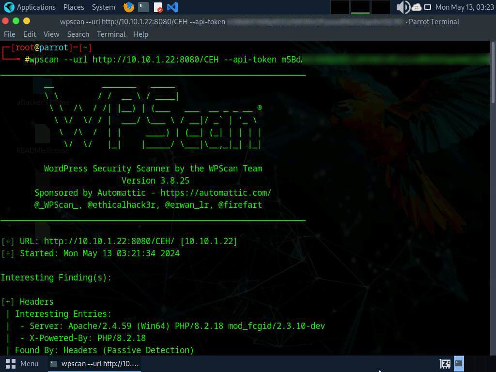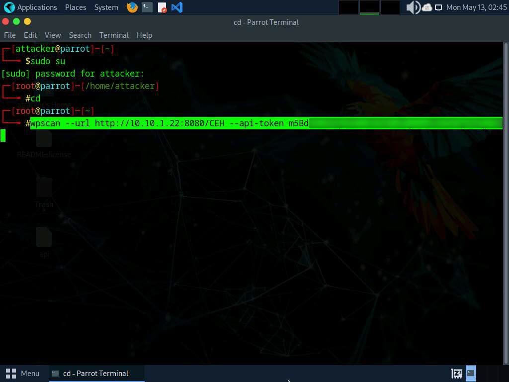In the Terminal window, run wpscan --url http://10.10.1.22:8080/CEH --api-token [API Token] command.