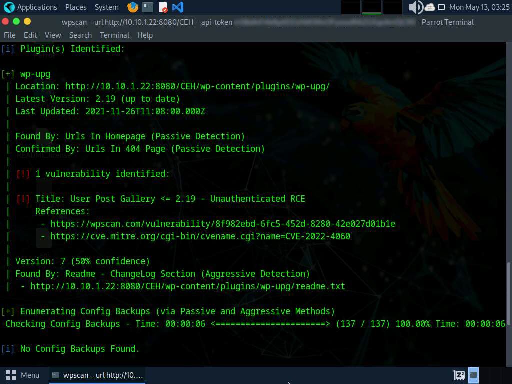 Scroll down to the Plugin(s) Identified section, and observe the installed vulnerable plugins (wp-upg) on the target website.