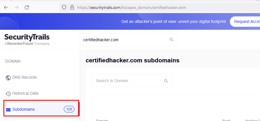 ## <mark style="color:red;">3. Subdomains and DNS using security trails</mark>