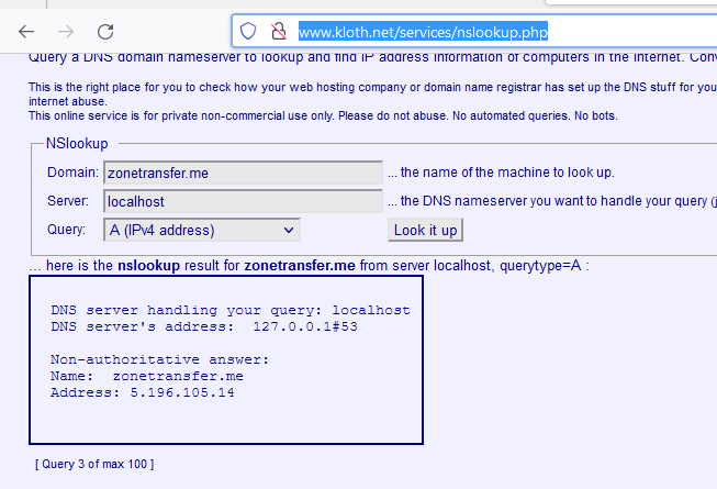zonetransfer.me.	7200	IN	SOA	nsztm1.digi.ninja. robin.digi.ninja. 2019100801 172800 900 1209600 3600