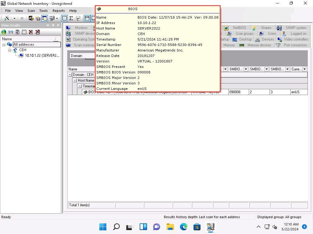 The results are displayed when the scan finished. The Scan summary of the scanned target IP address (10.10.1.22) appears.