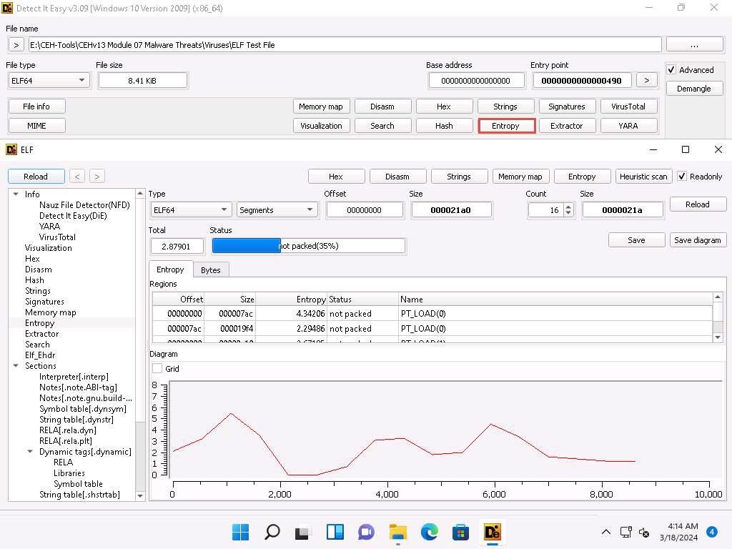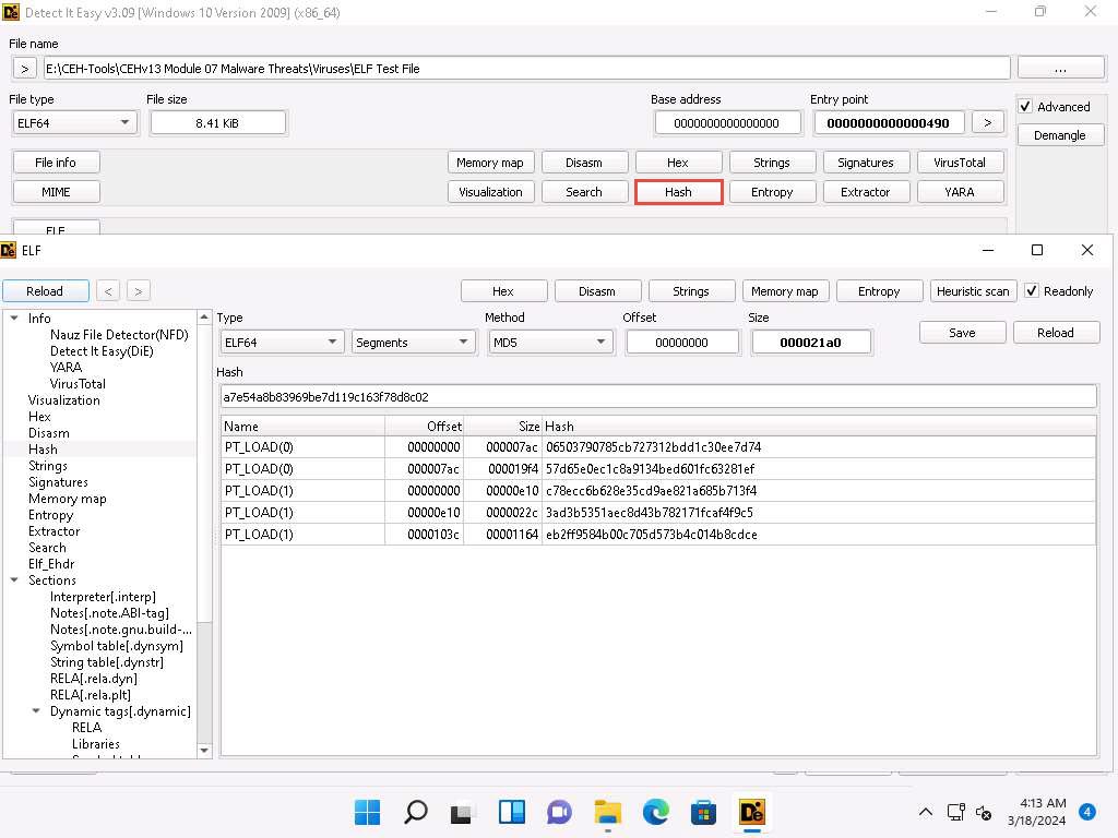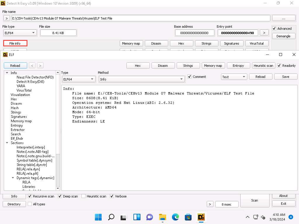 The Executable and Linkable Format (ELF) is a generic executable file format in Linux environment. It contains three main components including ELF header, sections, and segments. Each component plays an independent role in the loading and execution of ELF executables. The static analysis of an ELF file involves investigating an ELF executable file without running or installing it. It also involves accessing the binary code and extracting valuable artifacts from the program. Numerous tools can be used to perform static analysis on ELF files. In this task, we will be using Detect It Easy (DIE) tool to analyze ELF file. Detect It Easy (DIE) is an application used for determining the types of files. Apart from the Windows, DIE is also available for Linux and Mac OS. It has a completely open architecture of signatures and can easily add its own algorithms for detecting or modifying the existing signatures. It detects a file's compiler, linker, packer, etc. using a signature-based detection method.