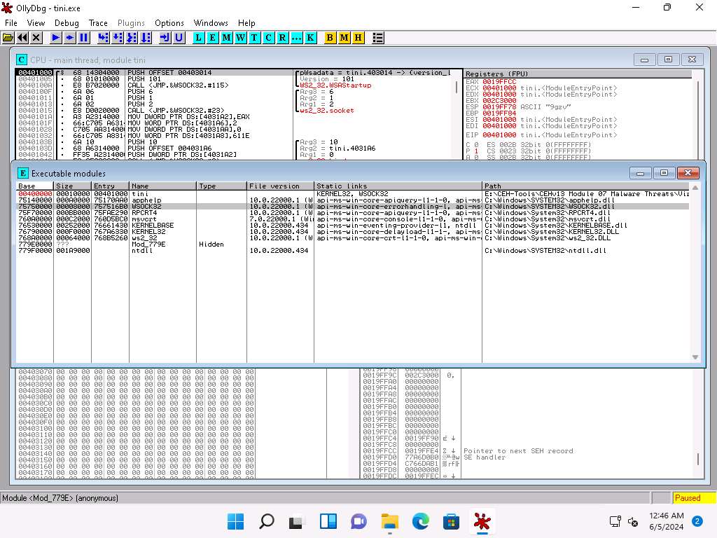 A window named Executable modules appears in OllyDbg, displaying all executable modules.