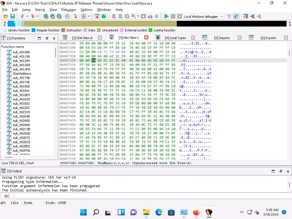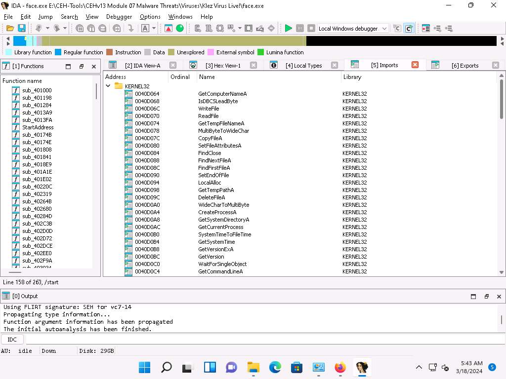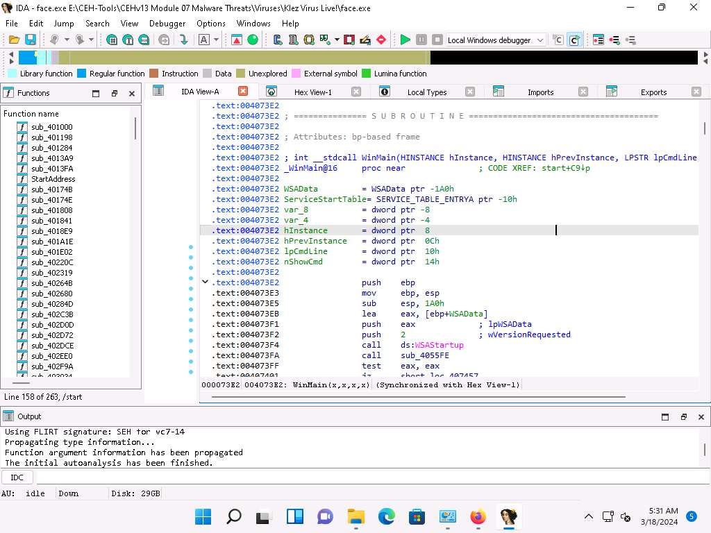 IDA completes the analysis of the imported malicious file and displays the results in the IDA View-A tab, as shown in the screenshot.