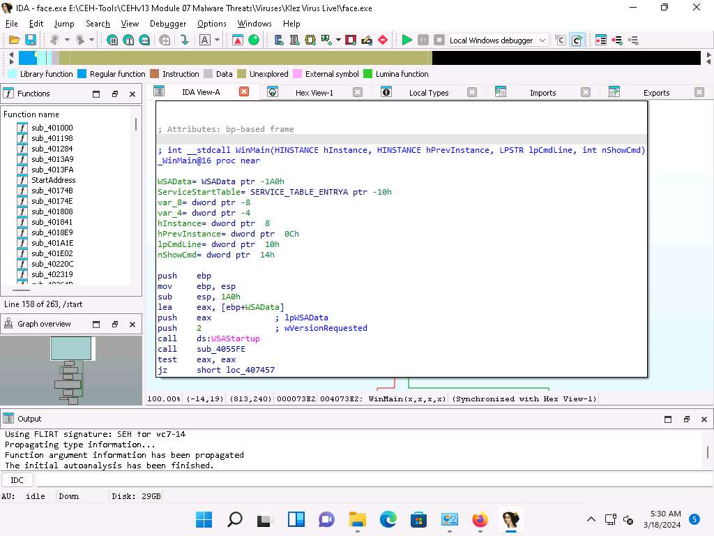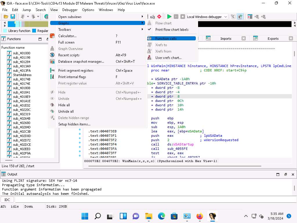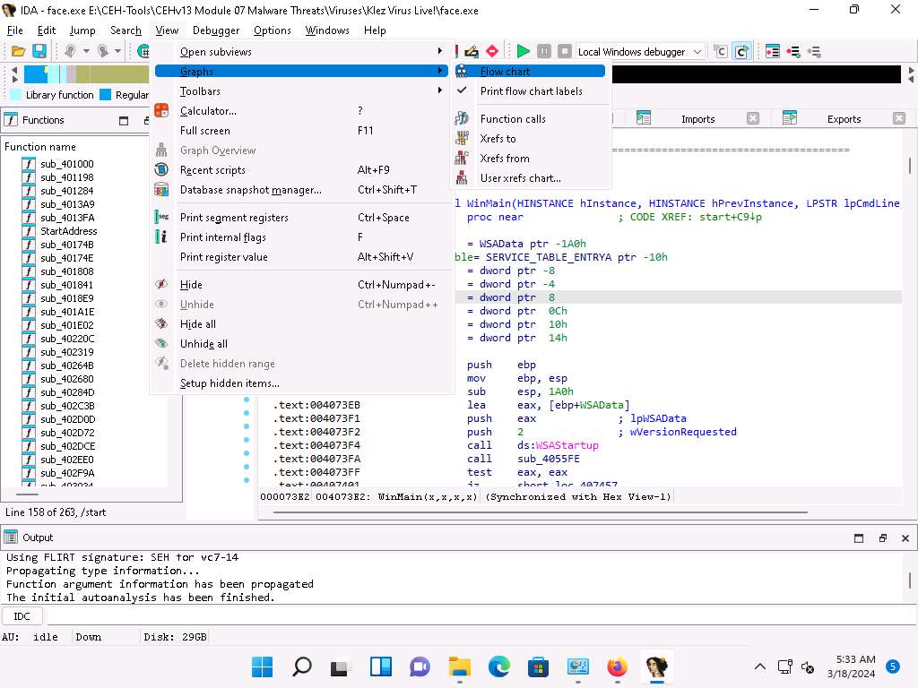 Screenshot Maximize the IDA window. To view the flow of the uploaded malicious file, navigate to View --> Graphs and click Flow chart.