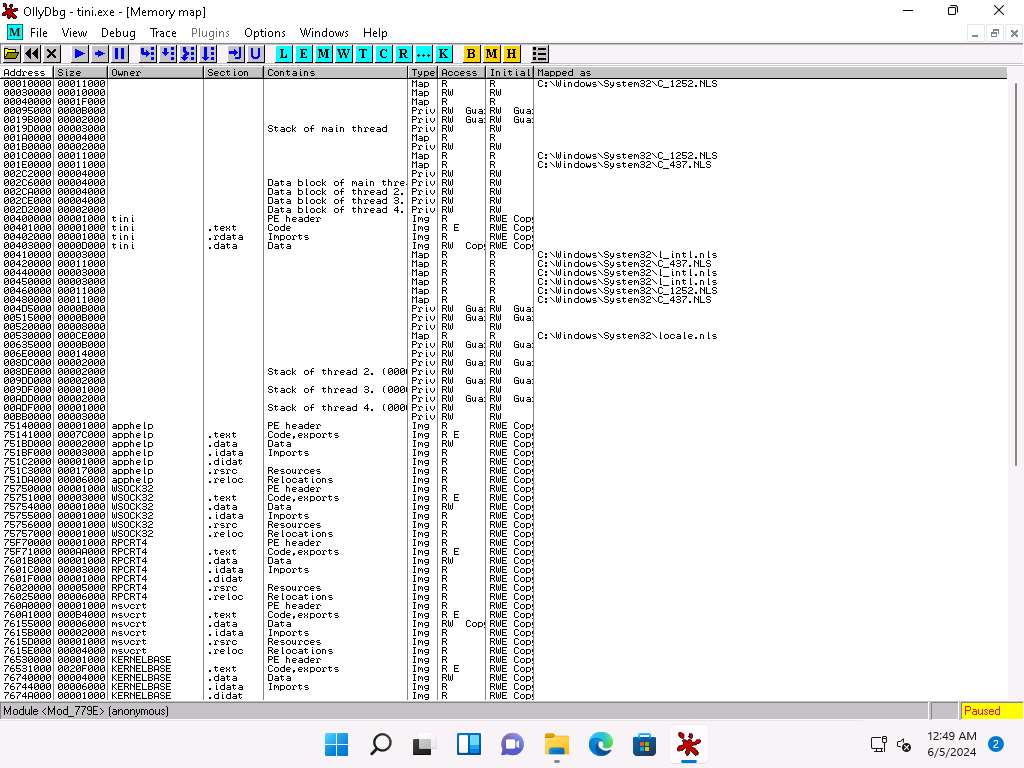 A window named Memory map appears in OllyDbg, displaying all memory mappings, as shown in the screenshot. Close the Memory map window.