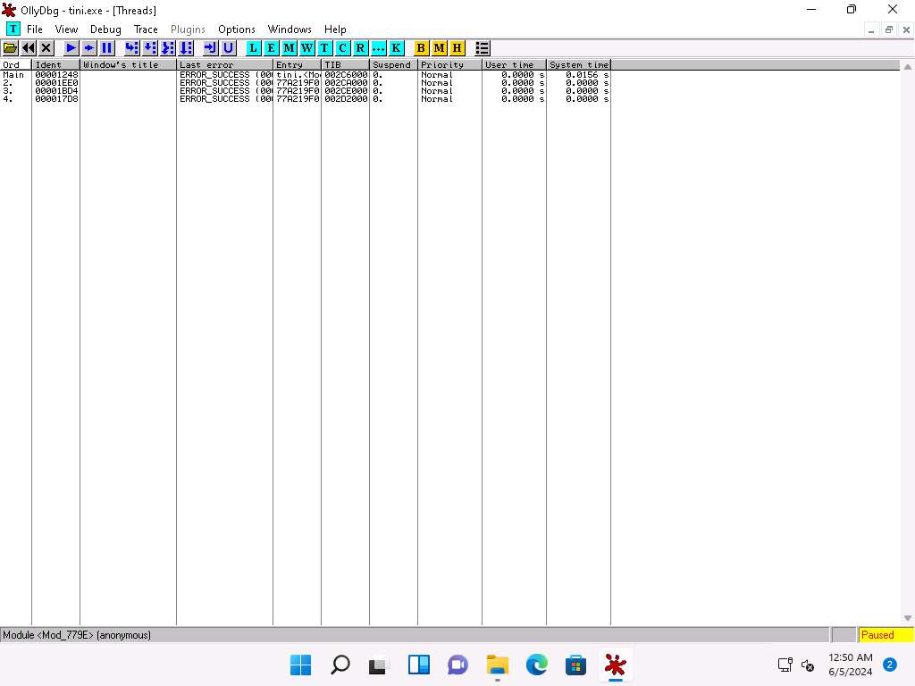 A window named Threads appears in OllyDbg, displaying all threads, as shown in the screenshot.