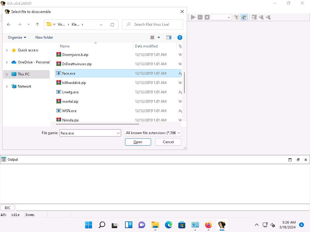 Screenshot The IDA main window appears, along with the Select file to disassemble window.