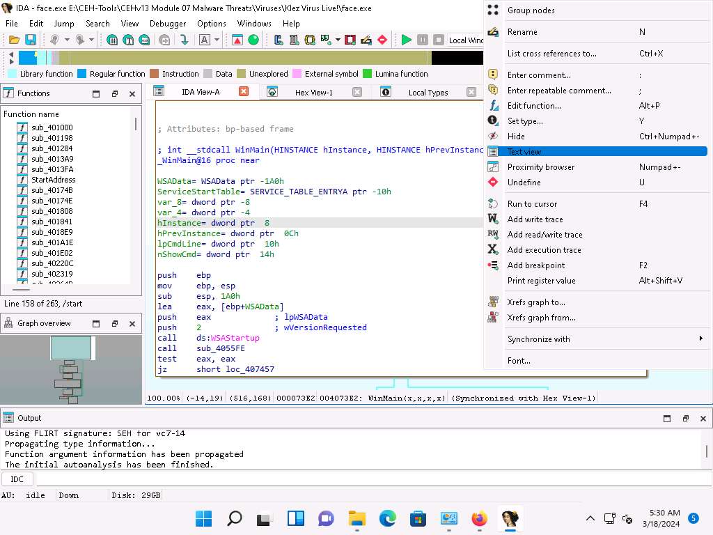 Screenshot In the IDA View-A section, right-click anywhere and choose Text view from the context menu to view the text information of the malicious file uploaded to IDA for analysis.