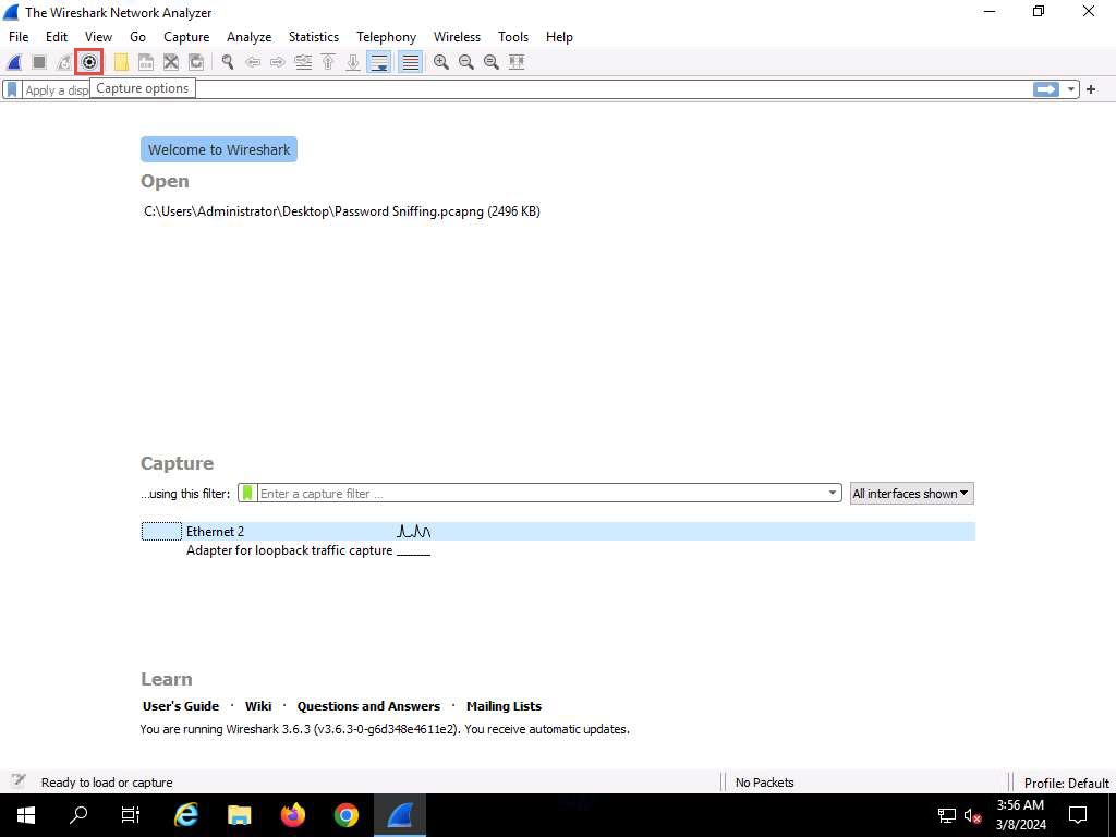 Now, in Windows Server 2019, launch Wireshark and click on Capture options icon from the toolbar.